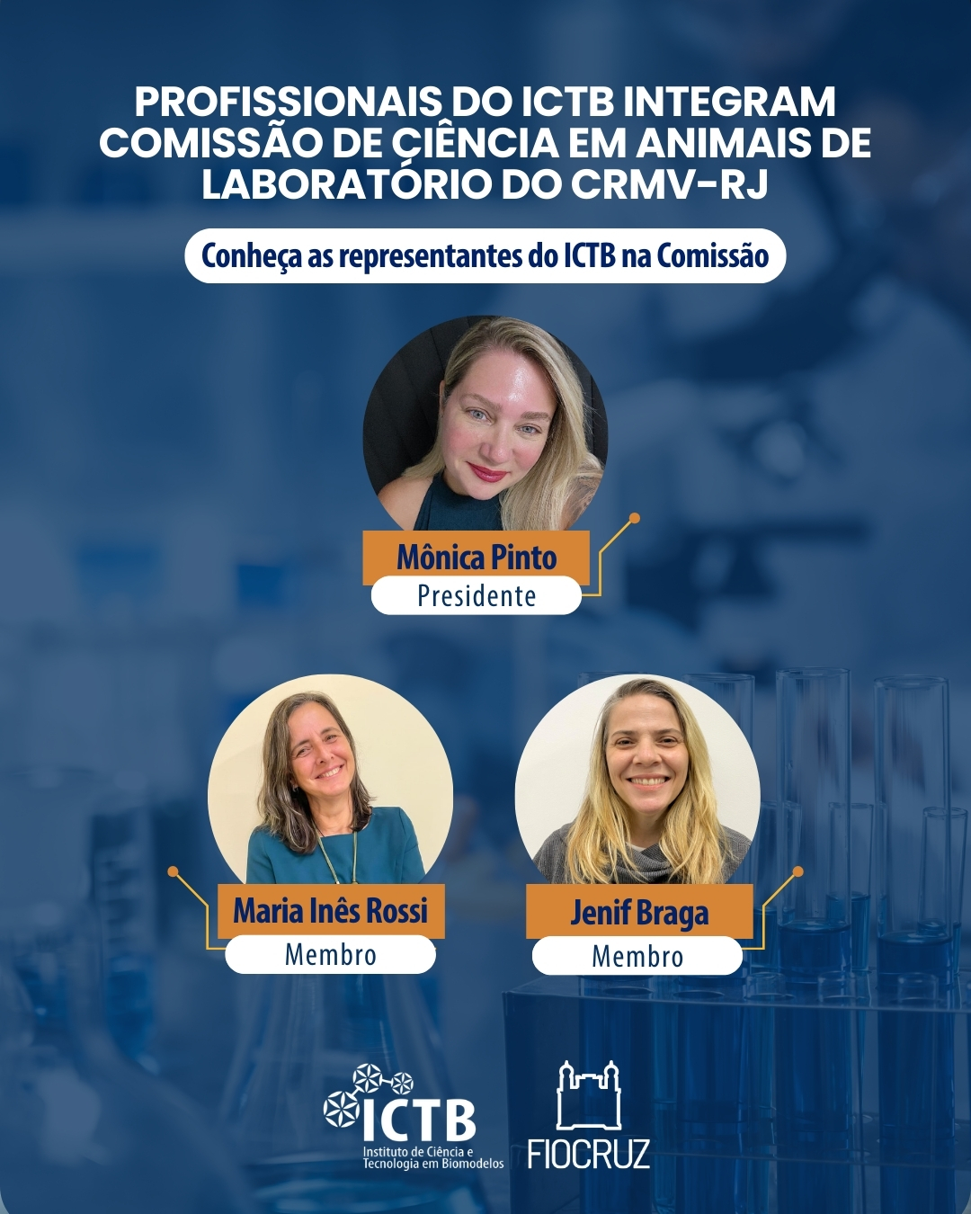 A Comissão, vinculada à Presidência do CRMV-RJ atualmente ocupada por Diogo Alves da Conceição, será presidida pela médica-veterinária Mônica Pinto, egressa do Mestrado Profissional em Ciência em Animais de Laboratório (MPCAL/ICTB/Fiocruz), com ampla experiência acadêmica e atuação consolidada na área, atualmente é profissional do Serviço de Uma Só Saúde (SSU/ICTB). Também integram o grupo as médicas-veterinárias Jenif Braga de Souza, do Serviço de Criação de Roedores e Lagomorfos (SCRL/ICTB), e Maria Inês Doria Rossi, da Coordenação de Ensino (CE/ICTB), evidenciando o reconhecimento institucional do Instituto como polo estratégico de formação, pesquisa e inovação.